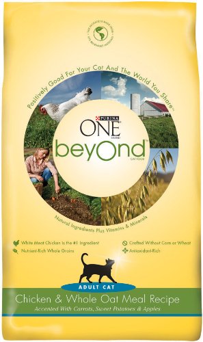 Purina ONE Beyond Chicken & Whole Oat Meal Adult Dry Cat FoodBeyond is crafted without corn, wheat, added fillers or artificial preservatives. We start with delicious chicken, a high quailty protein to help maintain strong muscles, including a healthy heart. Whole grain goodness from oat meal, brown rice and barley adds fiber for healthy digestion, carbohydrates for energy and omega fatty acids for a shiny coat. Formulated with accents of carrots, sweet potatoes and apples, which are harvested from nutrient-rich soil and contain antioxidants, vitamins and minerals to help support your cat's immune system. Marine-sourced omega 3 fatty acids contain nutrients that help give your cat noticeably bright eyes and healthy skin.Small steps for sustainability -- to us, going beyond means more than just naturally delicious ingredients. It means celebrating nature wherever and whenever we can to create pet food and reduce our environmental impact. We're taking small steps in all areas of our packaging and manufacturing. We use solar energy to help make ONE Beyond, at our plant in Denver. We use a certified Environmental Management System in our manufacturing plants. Our packaging is made from at least 92% renewable materials. The paper in our packaging is SFI (Sustainable Forestry Initiative) Certified and printed with soy-based inks.
