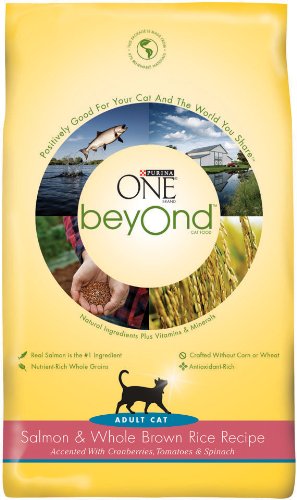 Purina ONE Beyond Salmon & Whole Brown Rice Adult Dry Cat FoodBeyond is crafted without corn, wheat, added fillers or artificial preservatives. We start with delicious salmon, a high quailty protein to help maintain strong muscles, including a healthy heart. Whole-grain goodness from brown rice, barley and oat meal adds fiber for healthy digestion, carbohydrates for energy and omega fatty acids for a shiny coat. Formulated with accents of carrots, tomatoes and spinach, which are harvested from nutrient-rich soil and contain antioxidants, vitamins and minerals to help support your cat's immune system. Marine-sourced omega 3 fatty acids contain nutrients that help give your cat noticeably bright eyes and healthy skin.Small steps for sustainability -- to us, going beyond means more than just naturally delicious ingredients. It means celebrating nature wherever and whenever we can to create pet food and reduce our environmental impact. We're taking small steps in all areas of our packaging and manufacturing. We use solar energy to help make ONE Beyond, at our plant in Denver. We use a certified Environmental Management System in our manufacturing plants. Our packaging is made from at least 92% renewable materials. The paper in our packaging is SFI (Sustainable Forestry Initiative) Certified and printed with soy-based inks.